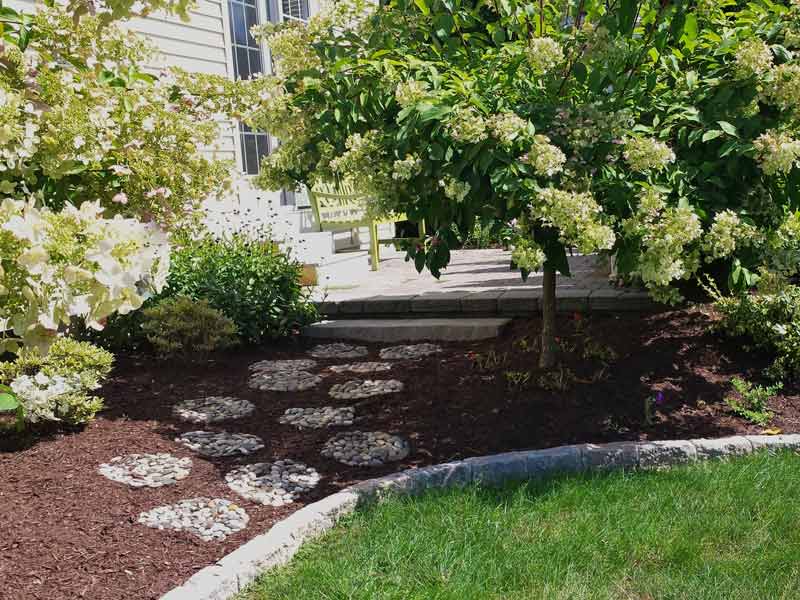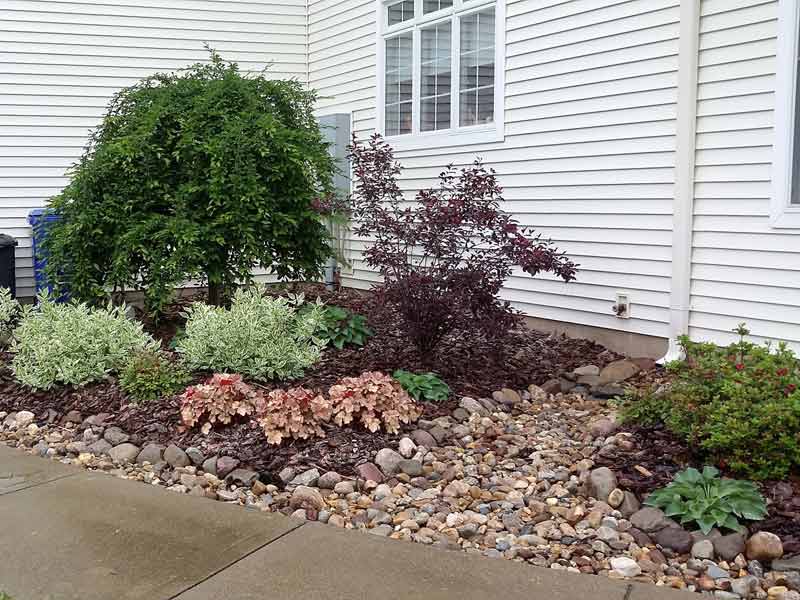 Begin with the addition of trees and shrubs that require minimal pruning and cleanup. Shrubs such as euonymus and berberis provide year long green leaves and require minimal pruning. Layering in native perennials with bulb accents that pop every spring will add low maintenance variation in height and color. Ornamental grass tends to be low maintenance as well. Next you would choose a forgiving ground cover that will thrive in the conditions of your garden and block weed growth. Finally, we recommend adding stone accents or mulch for low maintenance gardens on a budget, for further weed block, water conservation and eye catching accents.